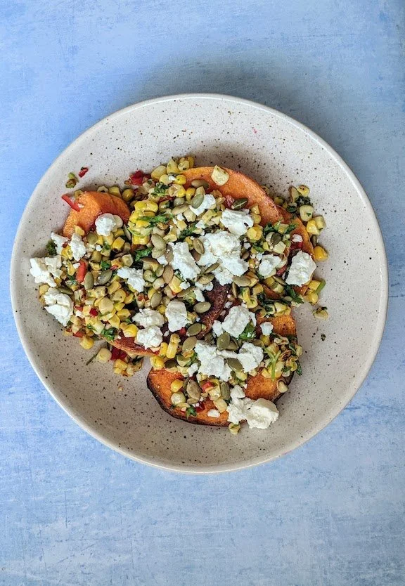 #225 butternut squash with sweetcorn salsa, feta and pumpkin seeds